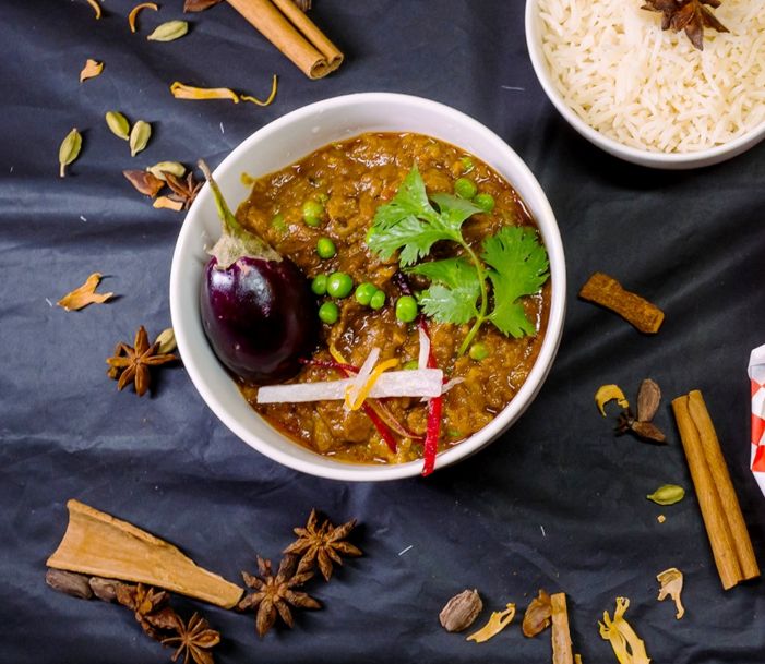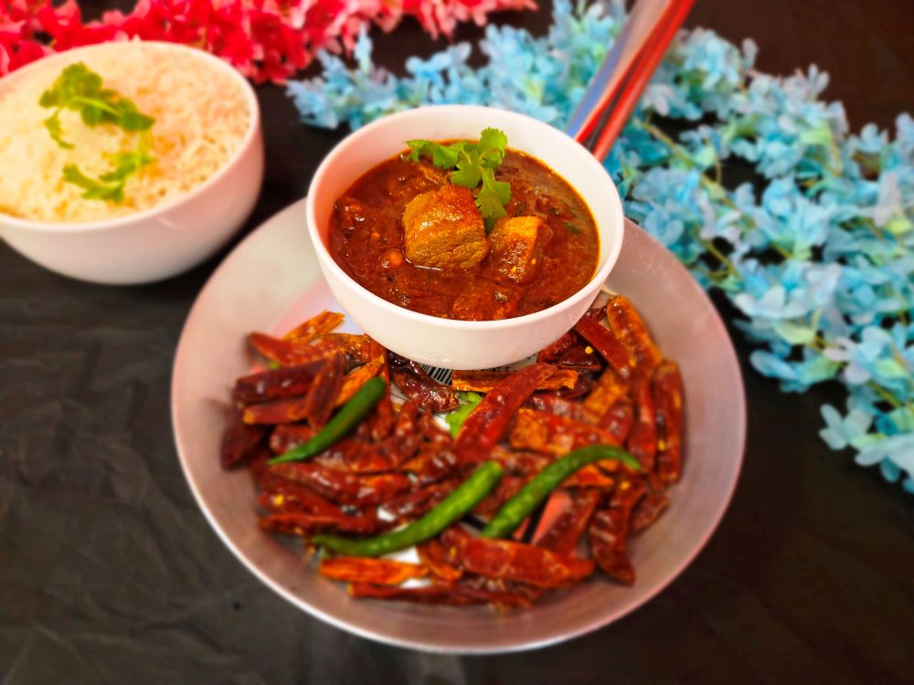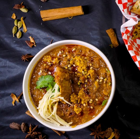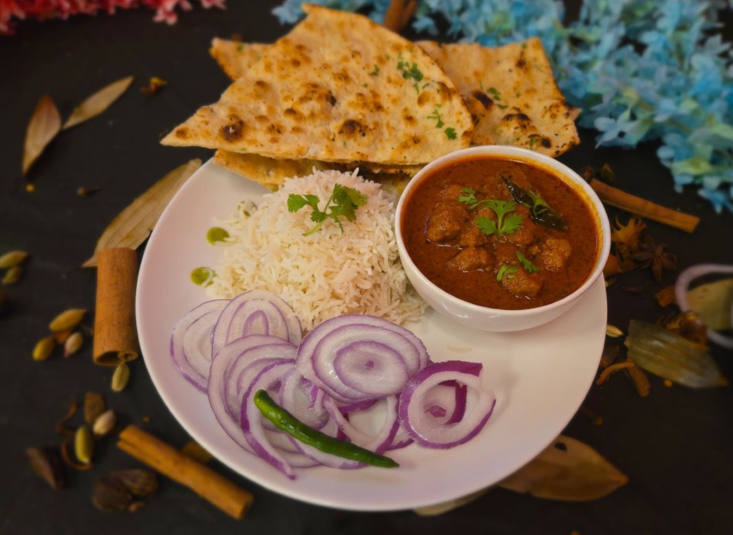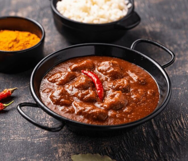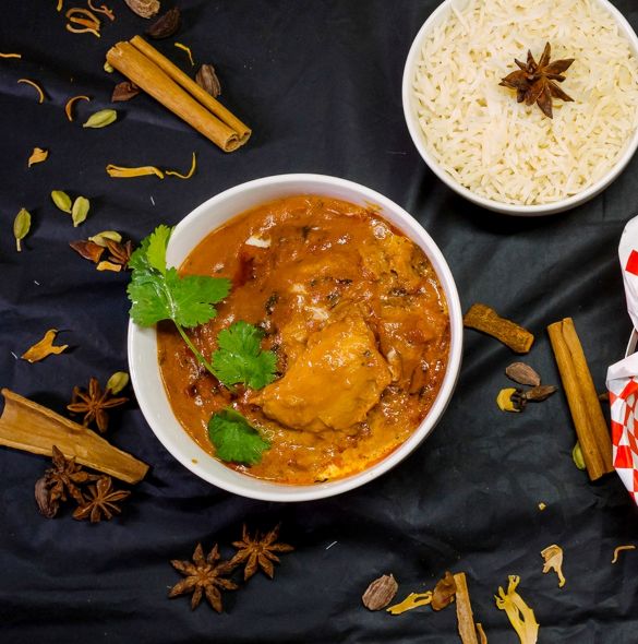 Boneless lamb in a rich, aromatic gravy of spices, onions, and tomatoes, garnished with fresh coriander.
