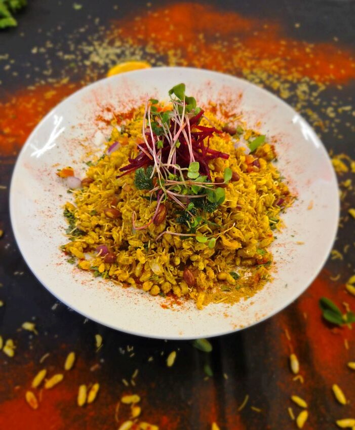 Puffed rice mixed with sev, onions, tomatoes, and tangy tamarind chutney, garnished with fresh coriander