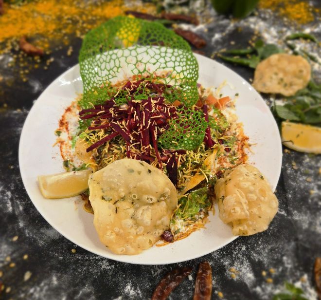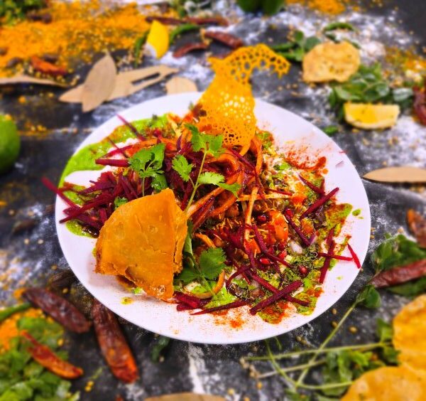 Crushed veg samosa with chana masala, yogurt, tamarind, mint chutney, herbs, and sev.