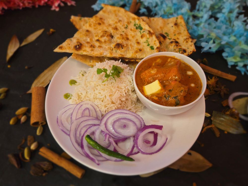 Boneless chicken in a rich tomato-cashew gravy, enhanced with a tadka of onions and tomatoes for a balanced flavor.