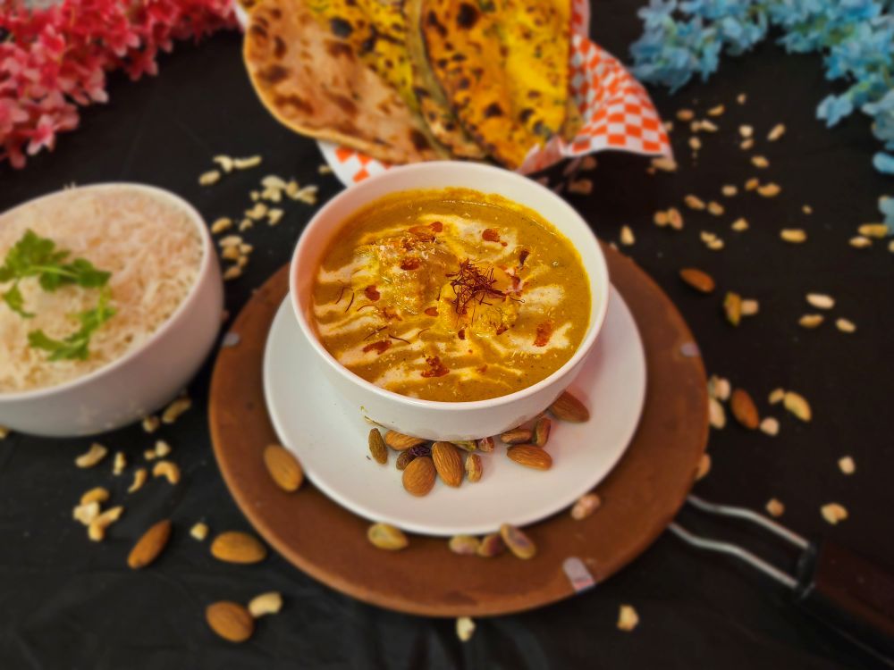 Tender boneless lamb in a creamy cashew and saffron gravy, topped with fresh cream.