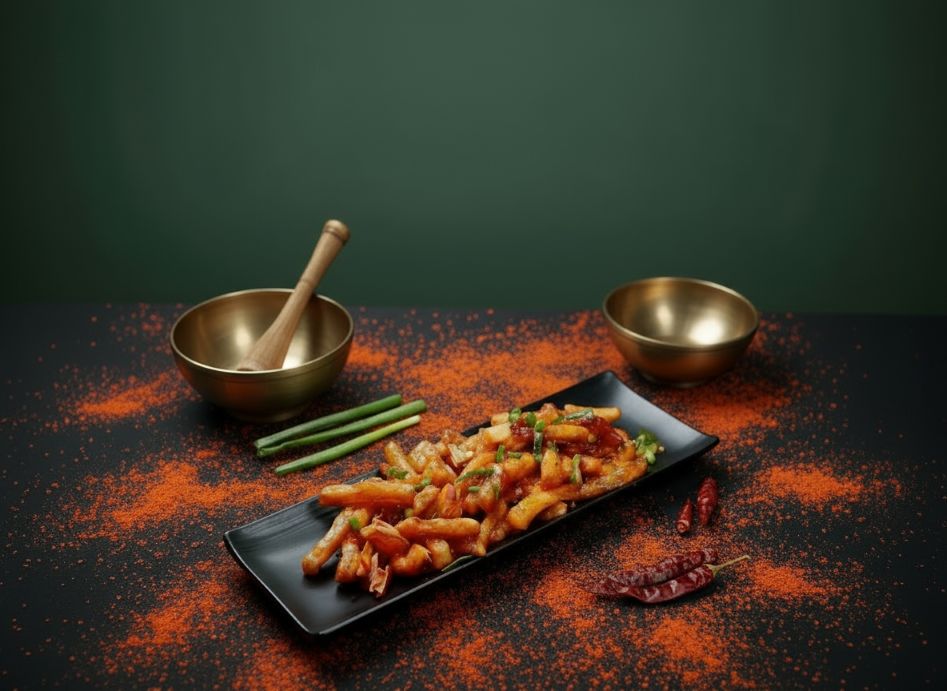 Introducing the zesty Indo-Chinese delight: crispy potato fingers, golden and deep-fried, tossed in a tangy, spicy sauce that tantalizes your taste buds with every bite!