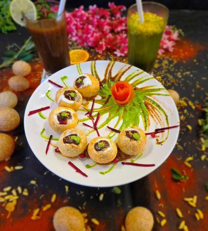 Crispy hollow balls filled with spicy potatoes, served with tangy and sweet flavored water.