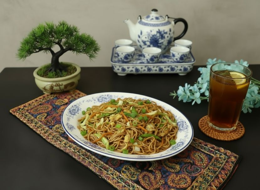 Savor the vibrant flavors of this classic Indo-Chinese stir-fry: chewy noodles embraced by fluffy scrambled eggs and a colorful medley of bell peppers, carrots, and cabbage in savory soy sauce!