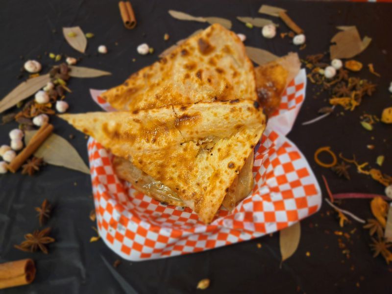 Jumbo veg samosas packed with potatoes, peas, spices, served with tangy tamarind and mint chutney.