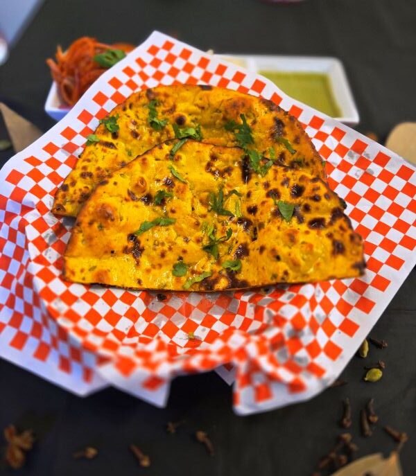 Crispy whole wheat dough, stuffed with spicy crushed paneer, cooked in a tandoor, and served with rich butter and creamy yogurt!