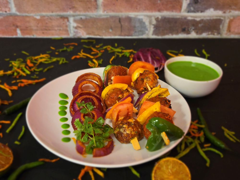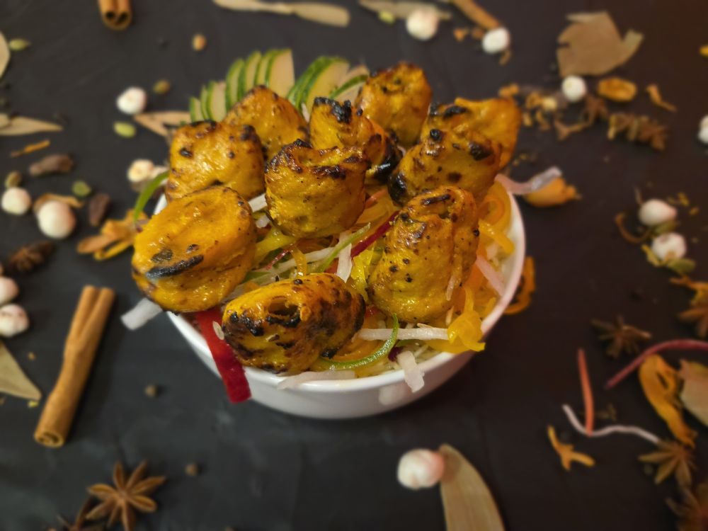 Soya chaap marinated in yogurt and pickle spices, cooked in tandoor, served with onion salad and mint chutney.