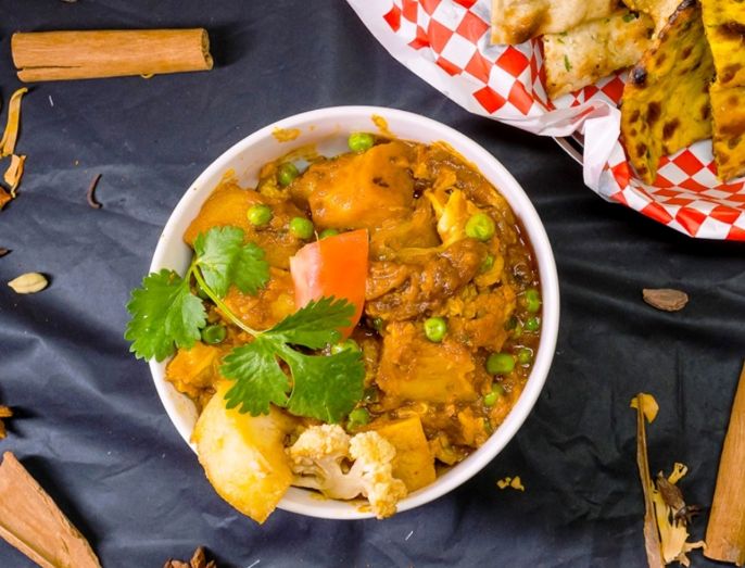 Cauliflower, potato, green peas and spices cooked with onions and tomatoes, garnished with fresh coriander.